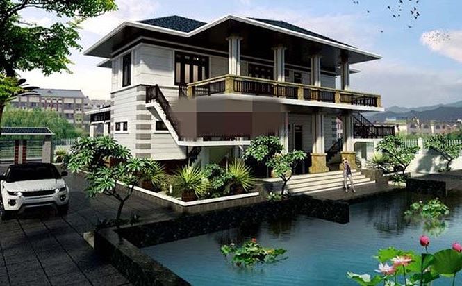 Ngôi nhà tạo chú ý với hàng cột to theo lối kiến trúc phương tây với đường vân chạy dọc trên thân cột. Phần mái nhà có kiểu mái Thái rộng rãi trông rất cá tính, đơn giản. Nền nhà ốp đá cao hơn so với mặt đất giúp việc lấy gió được tốt hơn, cũng như chống hiệu tượng ngập khi xảy ra mưa nhiều.